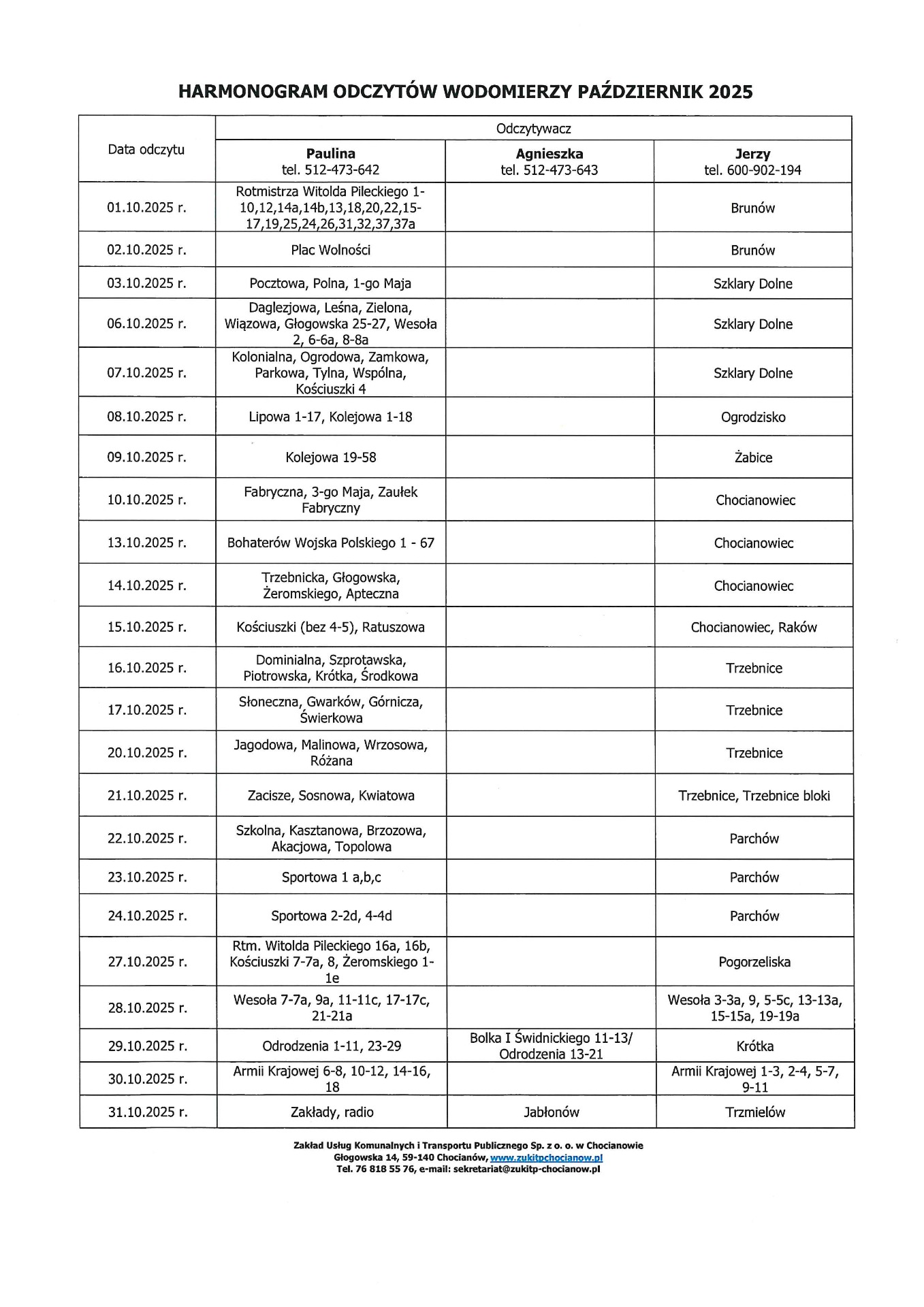 Harmonogram odczytów wodomierzy wrzesień 2025