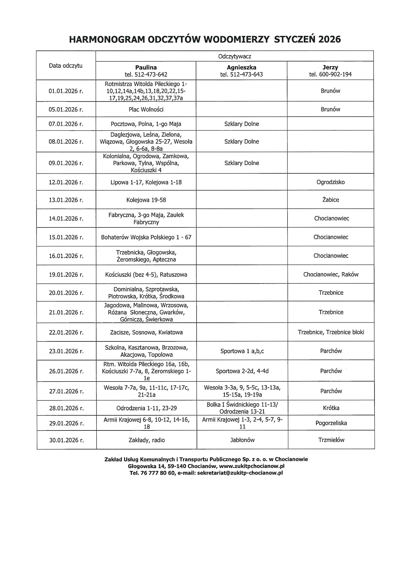 Harmonogram odczytów wodomierzy styczeń 2026 Drukuj Kopiuj link Facebook.com X.com Data publikacji: 18.12.2025 godz. 09:07 Wyświetlono: 23 Kategoria: Aktualności Zobacz również Zobacz więcej 22.10.2025 Aktualności Harmonogram odczytów wodomierzy listopad 2025 12.11.2025 Aktualności Zmiana adresu i telefonów kontaktowych Spółki Informujemy, że od dnia 12.11.2025 r. siedziba Spółki znajduje się w budynku Centrum Obsługi Administracyjnej (COA) przy ul. 3 Maja 4 w Chocianowie. Nowy numer kontaktowy Spółki: Sekretariat... 26.11.2025 Aktualności Harmonogram odczytów wodomierzy grudzień 2025